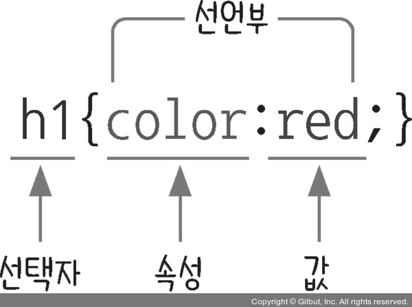 선언부는 선택자에서 선택한 태그에 적용할 스타일을 작성하는 영역으로, 중괄호({}) 안에 넣습니다